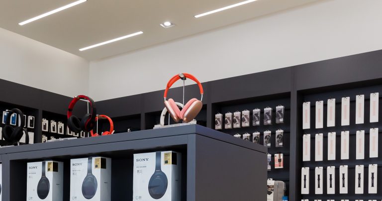 Apple headphone shelf: Apple headphone shelf is manufactured from stainless steel by Asia, with a shiny, luxurious look. Headphones are neatly displayed, making the space more professional.