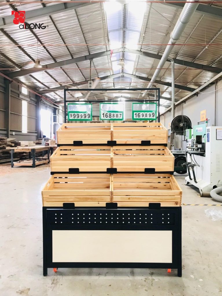 Supermarket Fruit Shelves: The fruit display shelves have great features of elegant design, wooden materials make the shelf not only serve the purpose of displaying fruits and vegetables but also decorate the supermarket. town. This type of shelf has a frame made of iron and uses a tray made of pine wood instead of corrugated iron, so the overall look is much more delicate and luxurious. Depending on the size of the stall, you can choose the right size shelf.